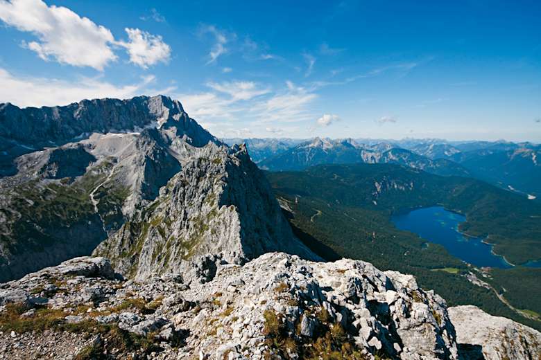 Die Besteigung beginnt wie bei der Zugspitze mit der wildromantischen Höllentalklamm – eine berauschende Ouvertüre! Am Höllentalanger klinkt man sich aus und laviert in den von unten kaum einschätzbaren Steilflanken immer höher, bis man nach der Schlüsselpassage in der Waxensteinrinne gipfelwärts gelangt. Im Kontrast zum wild umkränzten Höllentalkessel (mit dem Jubiläumsgrat im Profil!) öffnet sich jetzt auch die Schau über das Loisachtal und tief hinab zum Eibsee.