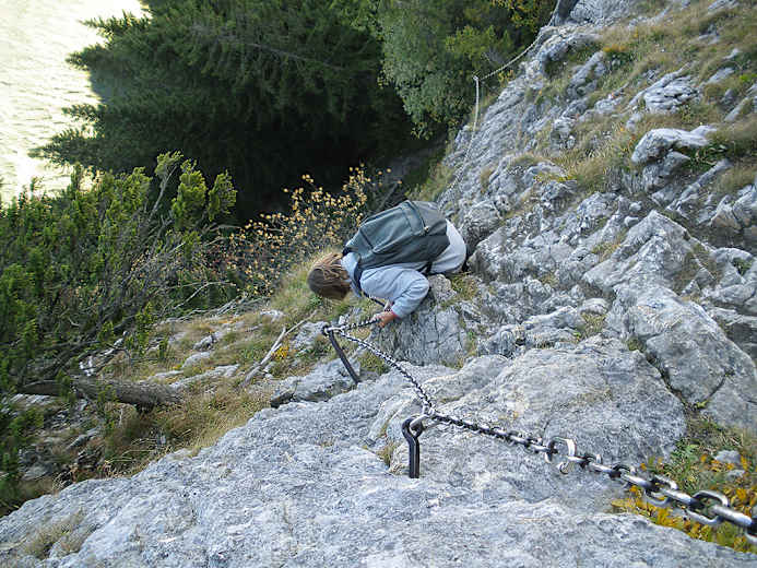 Der Weg führt erst ein wenig bergab, um dann wieder anzusteigen. Kurz nach dem Abzweig Richtung Ettal, erreicht man den mit Ketten gesicherten kurzen Klettersteig (1.574 m).