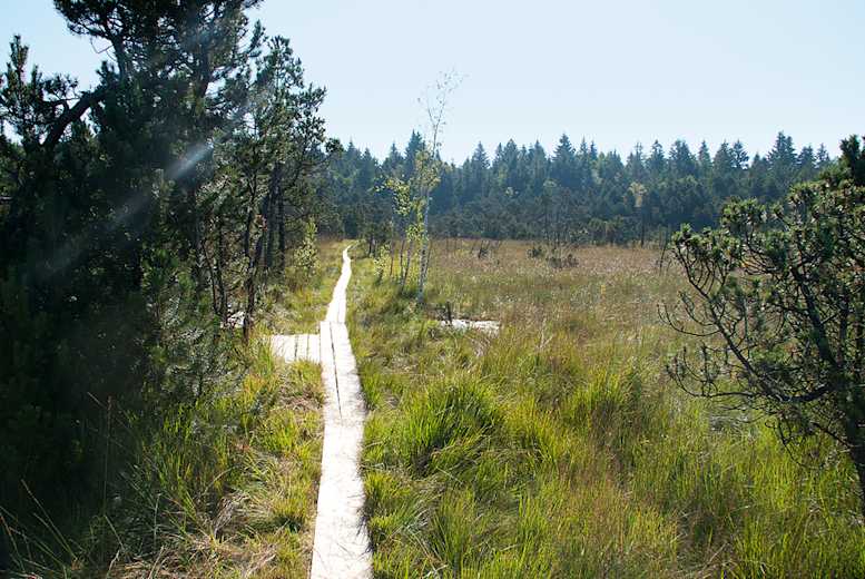 Ein wurzeliger Fußpfad geleitet uns noch ein Stück durch den Wald. Bald haben wir den Brettlesweg erreicht, der uns durch das Naturschutzgebiet Wiesfilz (855 m) führt.
