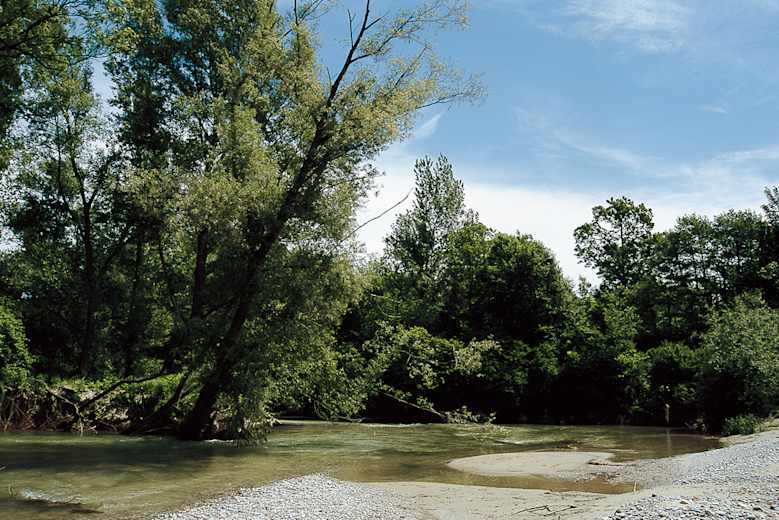 Bei höherem Wasserstand unbedingt anzuraten: Statt der Flussdurchquerung weiter auf dem Weg entlang der Au bis Landegg.