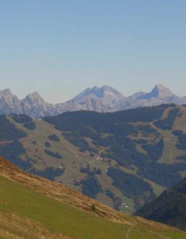 Die Überschreitung verläuft zunächst längs der Schneide gen Südwesten, bis man an den Felsabbrüchen zur Rechten vorbei ist und auf ca. 2.030 m eine Pfadspur entdeckt, die schräg in die Flanken hinabzieht. Sie knickt bald scharf rechts ab und leitet quer durch den oberen grasigen Steilhang auf die Roßfelder. Hier noch oberhalb eines Grabenansatzes entlang und anschließend über einen schönen Wiesenrücken Richtung Priesbergalm, 1.460 m, hinab. Sie liegt auf einem herrlichen Balkon vis-à-vis der Watzmann-Ostwand. Auf einem breiten Wirtschaftsweg wandern wir danach an der Enzianbrennhütte vorbei zum Königsbachgraben und vollenden die Tour auf der bekannten Strecke nach Hinterbrand.