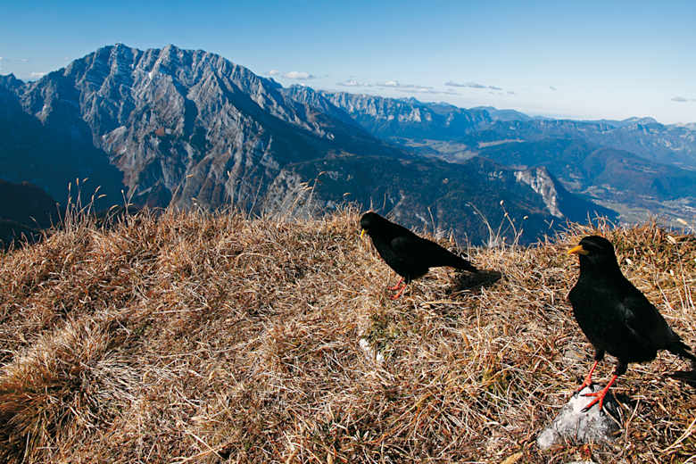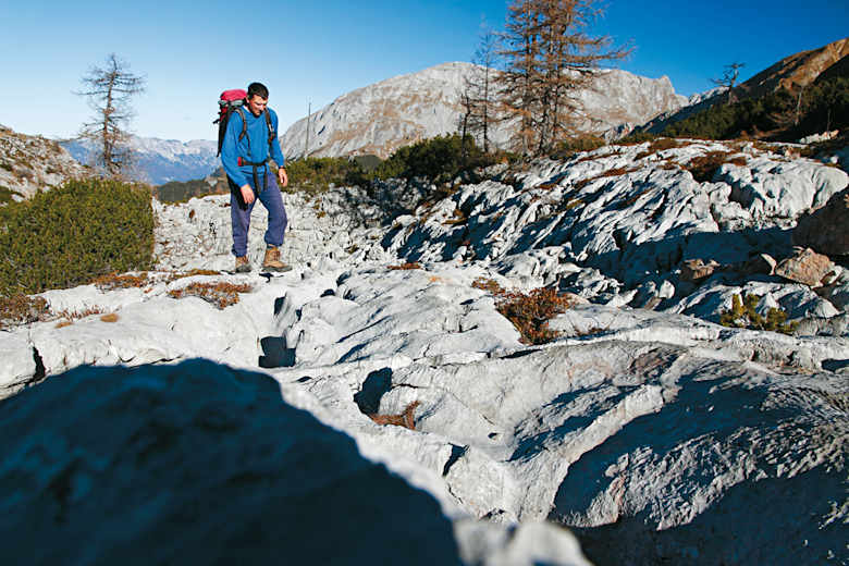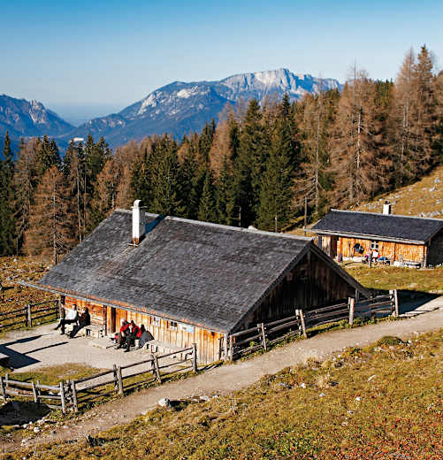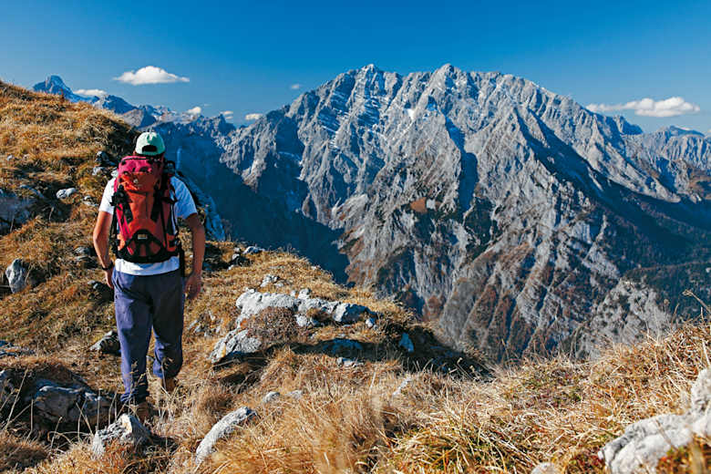 Im ausgedehnten Karstterrain, wo wir nur den Steindauben und dem eigenen Instinkt vertrauen können, schlägt das Herz dieser Landschaft. Ringsum begeistern die erhabenen Gebirgsszenerien der Berchtesgadener Alpen, allen voran „König“ Watzmann mit seiner gewaltigen Ostwand.