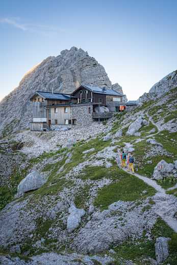 Der Steig führt dann nordwestlich zum Hochtor (Wegkreuz), einer Scharte, wo rechts der Zustieg zum Klettersteig Leogang Süd erfolgt (2,5 bis 3 Stunden). Ab hier hat man die Hütte bereits im Blick. Man folgt nurmehr links dem teilweise gesicherten Steig in der steilen felsigen Westflanke des Fahnenköpfls über die Mittagsscharte zur Passauer Hütte (2.033 m).