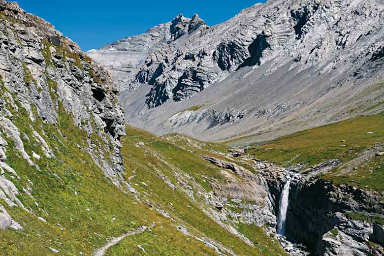 Hinter der Alphütte steigt man wieder bergauf, gelangt auf zunehmend kargere Böden und orientiert sich bei einer Gabelung links, um die auf einem Plateau gelegene Bifertenhütte, (2.482 m), anzusteuern.