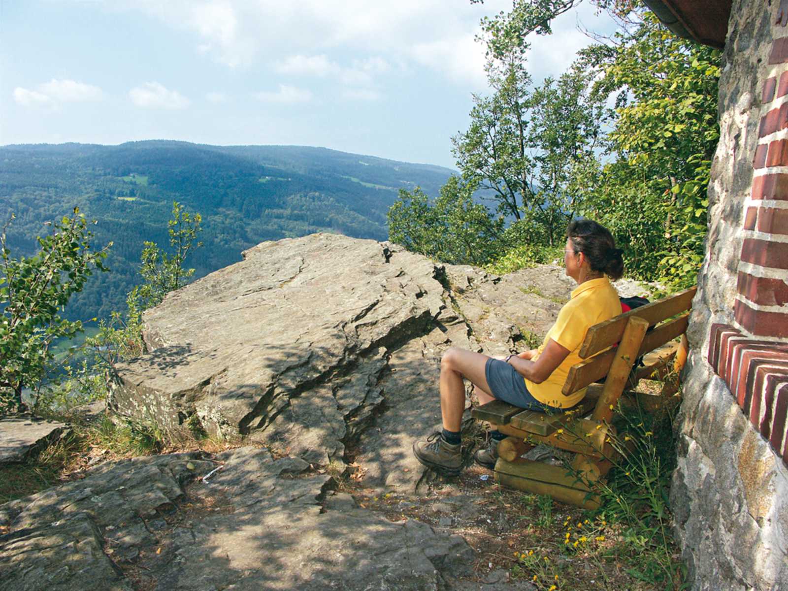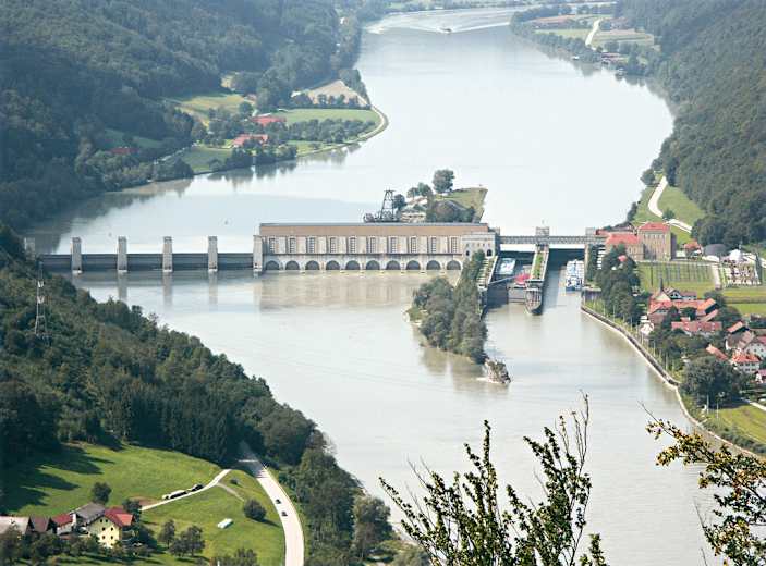 Wir queren eine weitere Straße und halten uns dann zweimal rechts. Nach einer Anhöhe biegt der Weg vom Waldrand in den Wald scharf rechts ab. Beim Ebensteinkopf (Kapelle) liegt das Donaukraftwerk Jochenstein fast unter uns. Hier bietet sich auch ein toller Blick auf Engelhartszell und das Kloster Engelszell.
