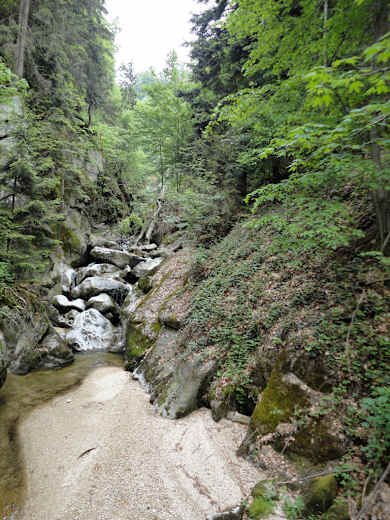 Der Donausteig führt zuerst östlich als Straße, später westlich als Steig entlang des Bachs. Eine Brücke quert den Bach und mittels Stufen, gesichert durch Geländer, gelangen wir durch den romantischsten Teil, zu einem mächtigen, über den Weg reichenden Felsen.