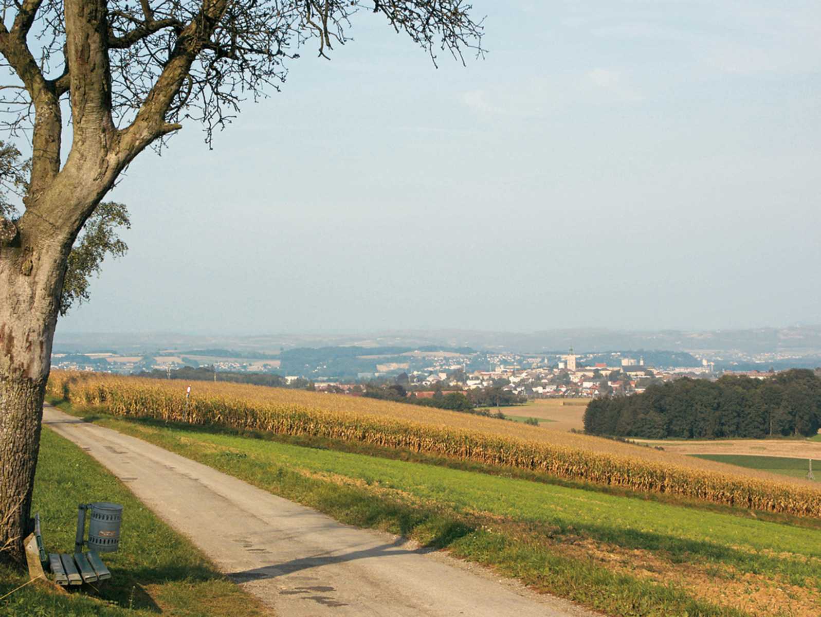 Von Weiling führt unsere Route auf Güterwegen in einem Linksbogen zuerst durch einen Wald, dann auf eine Anhöhe beim Hof Guster (P. 319).