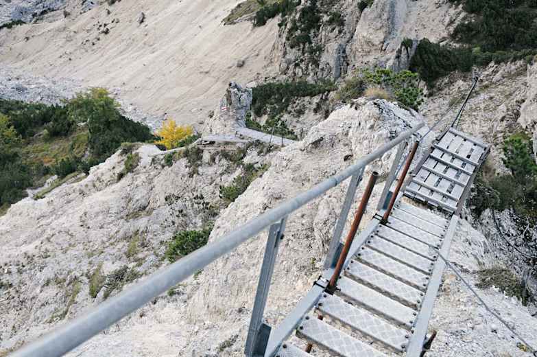Über einen Rücken gewinnt man weiter an Höhe, dann zieht der Weg Richtung Alpgartenrinne und führt direkt daneben über eine Rippe steil nach oben. Mit Holzstämmen und -brettern gebaute Stufen und Leitern wechseln sich ab mit Eisentreppen, an denen ein Geländer Sicherheit gibt, teilweise helfen auch Drahtseile über schmale und etwas exponierte Stellen. Es ist faszinierend, wie geschickt der Steig das Gelände und den knappen Platz nutzt.