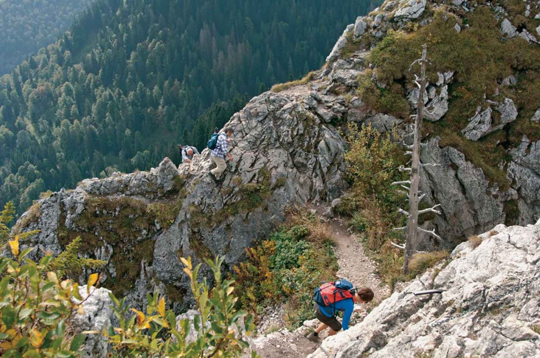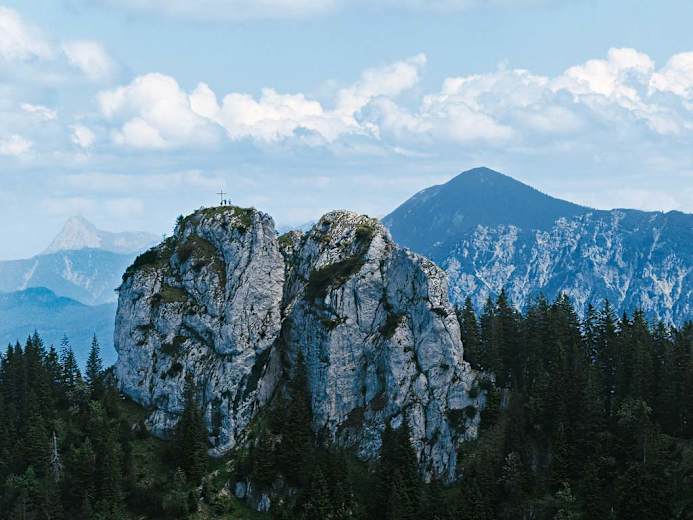 Die einen genießen das Panorama auf der Sonnenterrasse, die anderen zieht es für einen Wanderung hinüber zum Ettaler Manndl (1.633 m). Wobei der mit einem schlichten, aber großen Kreuz geschmückte Gipfel keinesfalls unterschätzt werden darf, schließlich führt der kurze Gipfelanstieg durch steiles Felsgelände. Der mit einer soliden Eisenkette gesicherte Anstieg auf den Felszahn ist für Geübte nicht schwer, doch der durch die vielen Begeher glatt polierte Fels ist überaus rutschig – und das Gelände sehr steil. Stürzen sollte man hier besser nicht ...