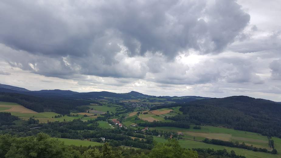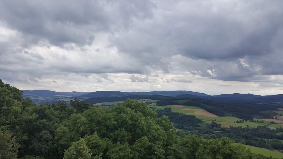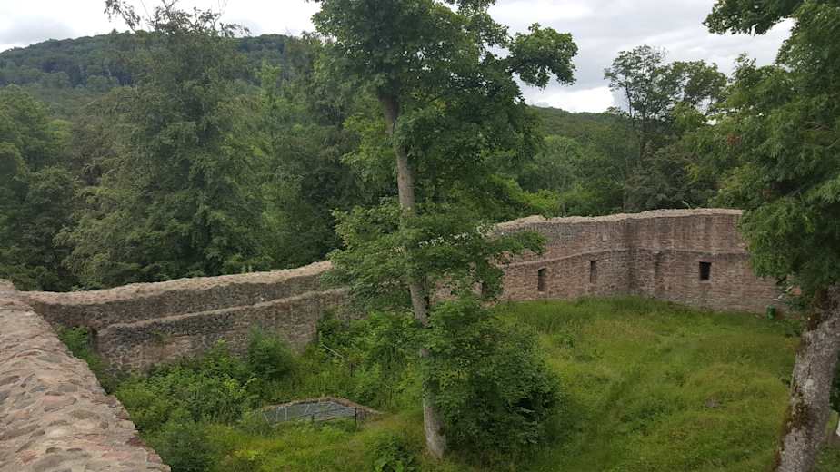 Der Aussichtspavillon auf der Burgmauer der Ruine Auersburg bietet eine herrliche Aussicht in das Scheppenbachtal und zur Milseburg.