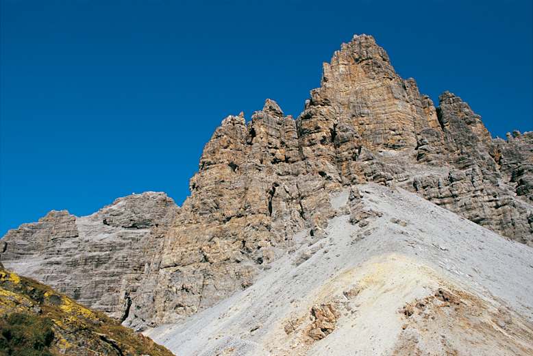 Zum Sendersjöchl, 2.477 m, ist dann wieder etwas Abstieg erforderlich. Von dort abermals südseitig mit einigen Kehren abwärts. In den Steilschrofen der Roten Wand gilt es sich besonders konzentriert fortzubewegen (allfällige Steinschlaggefahr); einige ausgesetzte Stellen sind versichert.