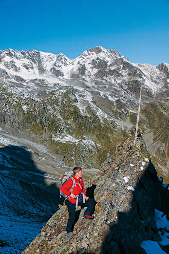 Im Bannkreis des Sulzenauferners: Über das Peiljoch in Tirol führt eine der kürzesten, gleichwohl spannendsten Hüttenverbindungen am Stubaier Höhenweg. Es wirkt wie ein Paukenschlag, wenn am Joch plötzlich der majestätische Sulzenauferner mit dem alles überragenden Zuckerhütl ins Blickfeld tritt. Was für eine Szenerie.