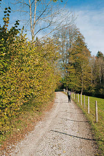 Der gemütliche Weg führt an einer Apfelplantage vorbei geradewegs nach Osten. Einen in einem Waldstück nach links abzweigenden Weg ignorieren wir und gehen weiter. Der Weg biegt nach links um und bringt uns nach einer weiteren Linkskurve direkt nach Westen. Bald biegen wir nach rechts ab. Der Weg wird nun etwas schmaler und steiler. Wir biegen wieder nach rechts ab und wandern am unteren Rand einer Wiese entlang. Nach der nächsten Linkskurve gehen wir in ein kleines Waldstück hinein. Nach diesem wandern wir noch kurz geradeaus bis von links der Sonntratn-Steig herauf kommt.