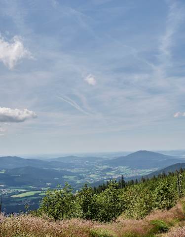 Auf herrlichen einsamen Pfaden steigen wir auf zum Gipfel des Großen Osser und zur Schutzhütte, die mit einfachen Speisen und grandioser Balkonlage über dem Böhmerwald aufwartet.