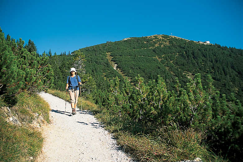 Der Weg führt in Kehren durch lichten Fichtenwald hinauf zur Heimgartenhütte (1.785 m). Links um die Hütte herum ist man gleich auf dem Gipfel des Heimgartens (1.790 m).
