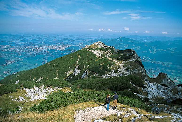 Blick vom Salzburger Hochthron auf Zeppezauer Haus und Geiereck. In der Tiefe ist links Salzburg zu erkennen. Foto: Gerhild Abler