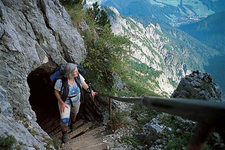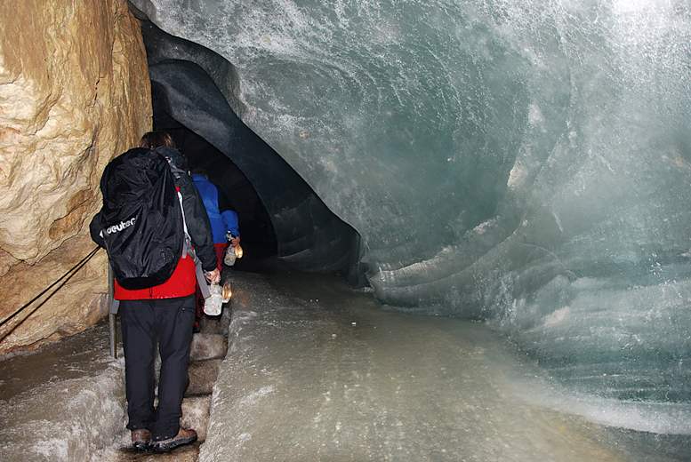 Die bekannteste ist die Schellenberger Eishöhle, Deutschlands größte und einzige erschlossene Eishöhle. Die Eismassen innerhalb der Höhle werden auf ca. 60.000 m³ geschätzt und haben eine Dicke von bis zu 30 Metern. Es lohnt sich, an einer der Führungen teilzunehmen. Am zweiten Tag, beim Abstieg zur Toni-Lenz-Hütte, kommen wir fast direkt am Eingang der Höhle vorbei. Der Weg hierher verläuft über den Thomas-Eder-Steig, eine vom „Verein für Höhlenkunde Schellenberg" errichtete beeindruckende Steiganlage mit Treppen, Stiegen und Tunneln.