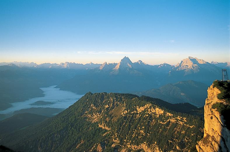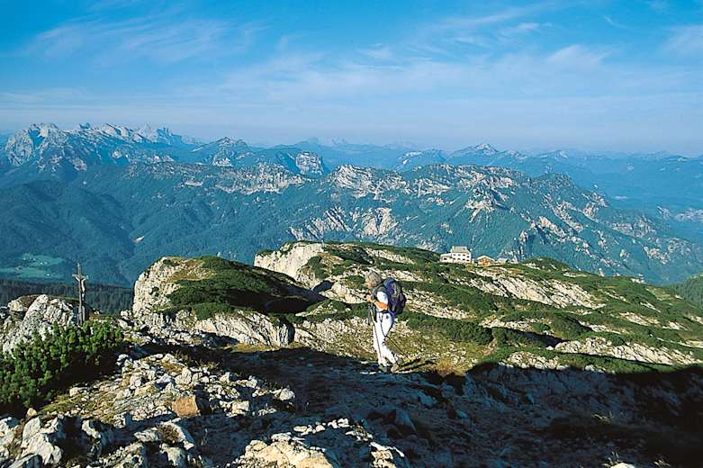 Hier haben wir einen fantastischen Rundblick auf Osterhorngruppe, Dachstein, Tennengebirge, Hohen Göll, Hochkönig, Steinernes Meer, Watzmann, Hochkalter, Leoganger Steinberge, Reiteralpe, Loferer Steinberge, Kaisergebirge, Lattengebirge und Chiemgauer Alpen.