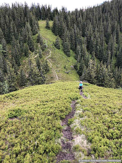Die Hütte bietet sich für eine Rast an, bevor es Richtung Südosten zum ersten Gipfel der Tour weitergeht. Erst über Wiesen und ab der Treffner Alm steiler durch den Wald erreichen wir den Spielkogel, 1.731 m (Wegnummer 673). Dann folgen wir dem Höhenrücken, mit kurzem Ab- und Wiederaufstieg beim Brunntörl, vorbei an der Abzweigung zum Wolfsbacherturm, 1.747 m (kurzer Abstecher möglich), zum Anhartskogel, 1.764 m. Weiter geht es durch Heidelbeerfelder, vorbei an Moortümpeln und kleinen Bachläufen zum nächsten und letzten Gipfel, dem Niederberg, 1.688 m. Fünf Minuten nach dem Niederberg verlassen wir bei der Abzweigung in den Sebringgraben, 1.640 m, schweren Herzens den Höhenrücken und biegen an der gut beschilderten Weggabelung scharf links ab (Wegnummer 675).