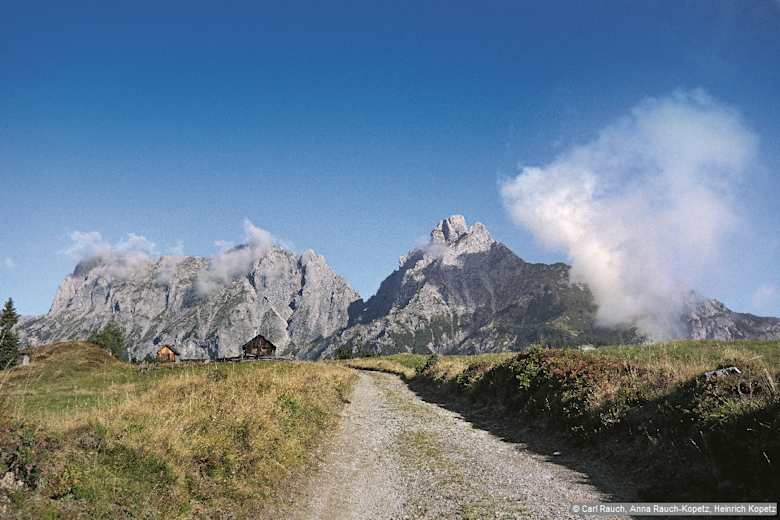 Blick zurück auf Admonter Reichenstein, Sparafeld und Kalbling (von rechts) kurz nach der Mödlinger Hütte. Foto: Carl Rauch, Anna Rauch-Kopetz, Heinrich Kopetz, Bergverlag Rother GmbH