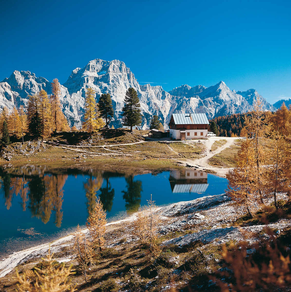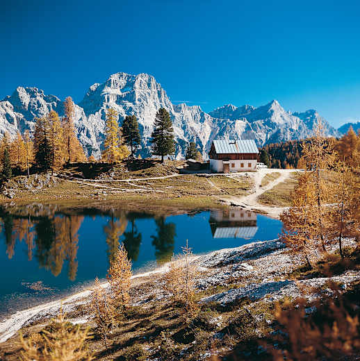 Danach geht es über den Cason di Formin hinauf zur großen Höhenterrasse östlich unter den Croda-da-Lago-Türmen und zu dem von zauberhaften Lärchenbeständen umgebenen Lago di Federa. Nach Rast und Stärkung an der Croda-da-Lago-Hütte nehmen wir den Rückweg über die verfallene Alpe di Formin.