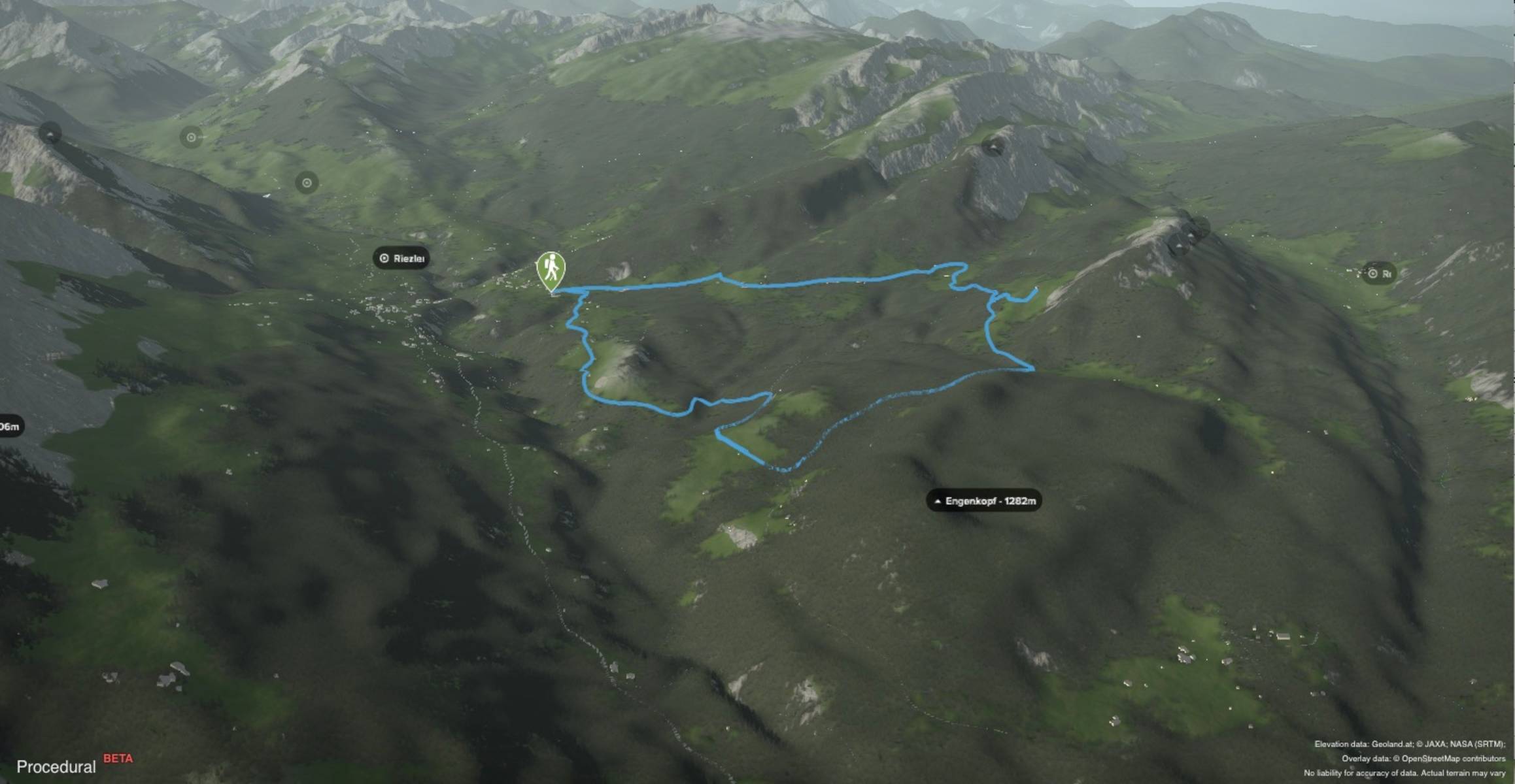 Ab dem Gasthof Bergblick, 1.080 m, ist die Straße für den öffentlichen Verkehr gesperrt. Wir halten uns nordwärts und wandern die Straße gemächlich bergauf, vorbei an vereinzelten Häusern und offenen Wiesen mit einem weiten Blick ins Tal bis hinüber zu Nebelhorn und Fellhorn.
