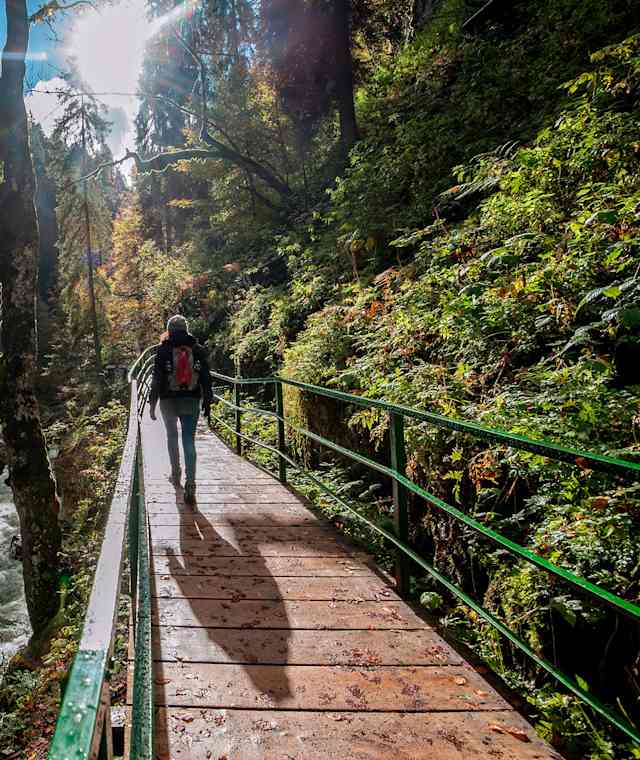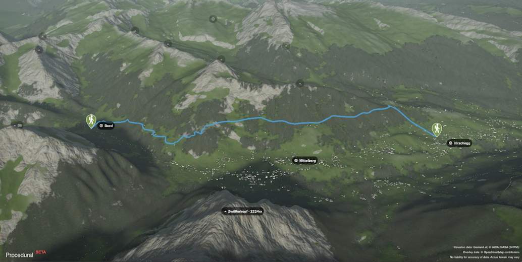 Direkt an der Hütte beginnt der Abstieg hinunter Richtung Erlenboden. Der Weg verläuft teilweise extrem steil durch Wald und Wiesen den Hang hinab, bis wir bei einem Bauernhof (1.272 m) einen breiten Fahrweg erreichen, auf dem wir uns nach rechts wenden. Auf dem sonnigen Höhenweg wandern wir leicht ansteigend Richtung Baad und passieren das Café Alpenwald, 1.295 m. Kurz darauf beginnt unser Abstieg nach Baad.