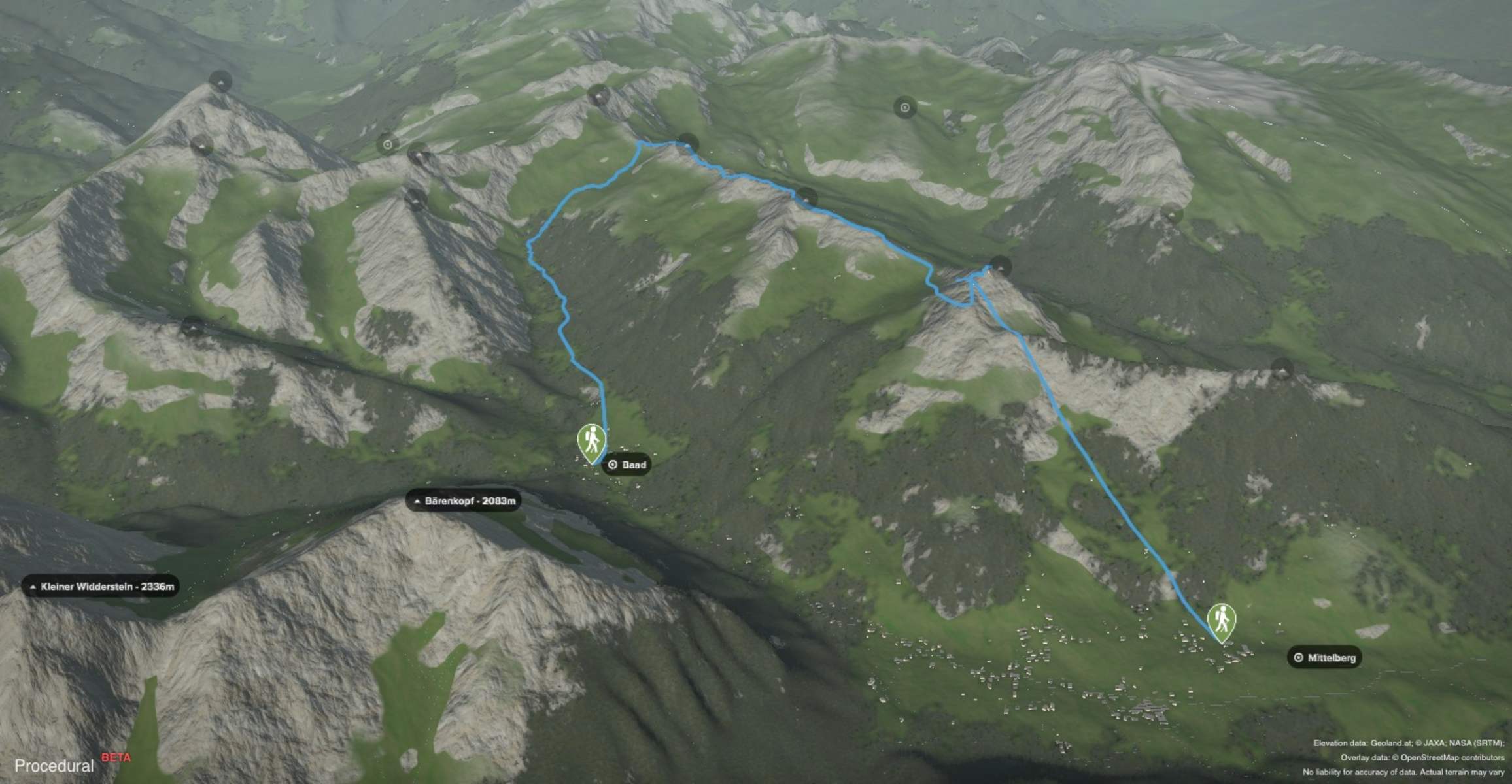 Dessen östliches Ende bildet das hoch über Mittelberg gelegene und mit einem prächtigen Panorama gesegnete Walmendinger Horn. Und genau über diesen schmalen Grat verläuft unsere Tour, die sehr gute Trittsicherheit verlangt und uns dafür auf der gesamten Länge mit wunderschönen, freien Ausblicken belohnt, ehe wir gemütlich durch das Tal des Turabaches nach Baad absteigen.