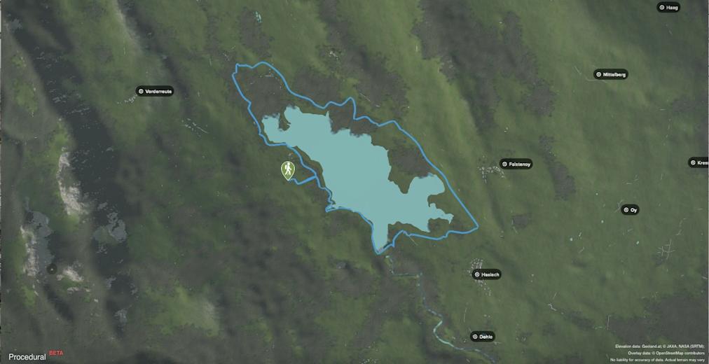 Gegenüber dem Kletterwald-Parkplatz zweigt ein schmaler Kiesweg ab, der uns durch offene Wiesen Richtung Haslach leitet. Vorbei am Campingplatz Wertacher Hof geht es schließlich links auf einen breiten, schnurgeraden Schotterweg, dem wir knapp 1,5 km entlang des Westufers des Sees folgen. Wir nähern uns kurz der Bundesstraße (mit kleinem Parkplatz) und biegen wenige Schritte später links in einen Weg Richtung See ein, um knapp 200 m weiter rechts auf einem angenehm weichen Rindenmulchweg in einen Fichtenwald einzutauchen. Direkt hinter dem Wald hat auf der Wiese – etwas überraschend und auf den ersten Blick leicht zu übersehen – ein Biber ein wenig das Gelände umgestaltet (Stand Frühling 2014; sollte der kleine Teich inzwischen wieder verschwunden sein, hat der Nager beim Bau wohl gepfuscht oder sich unbeliebt gemacht).
