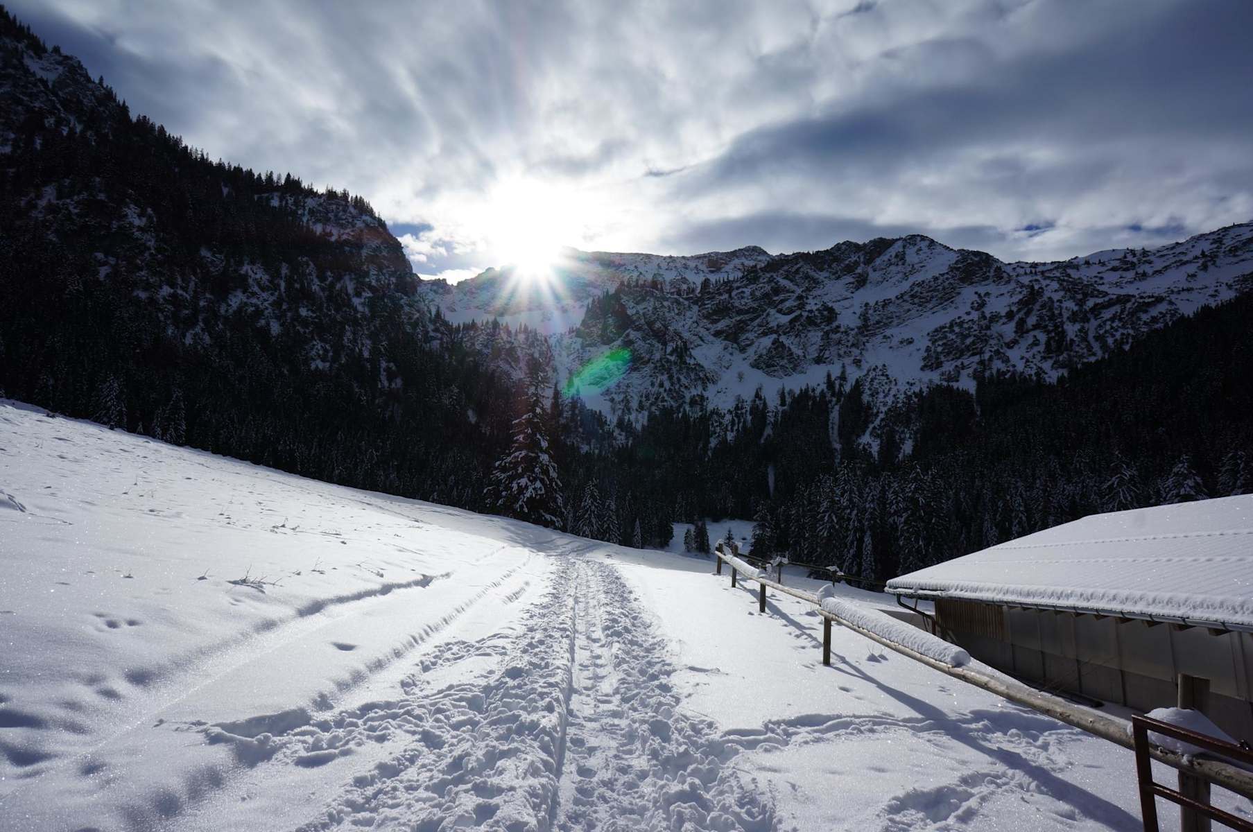 Der Aufstieg ist der anstrengendste Teil, doch wenn man das einmal geschafft hat, befindet man sich im winterlichen Hochgebirge mit grandiosem Ausblick auf die nahen Tannheimer Berge. Das Ziel, die Vilser Alpe (1.227 m), ist bald erreicht.