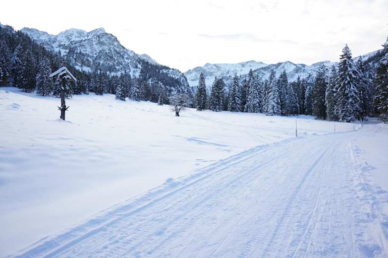 Keine sonderlichen Schwierigkeiten sollte man auf dem Weg hinauf zur Vilser Alpe haben, 400 Höhenmeter sind jedoch zu bewältigen. Über einen breiten, geräumten Fahrweg geht es hinauf in die winterlichen Berge.