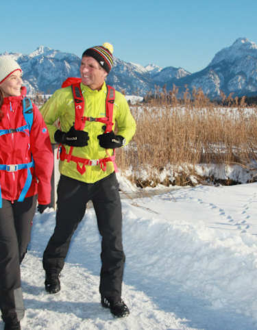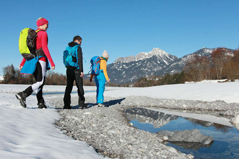 Man wandert entlang des mächtigen Flusses mit grandiosem Ausblick auf das Lechtal und die Gipfel umher, ein Teil der Strecke führt durch einen stillen Winterwald.