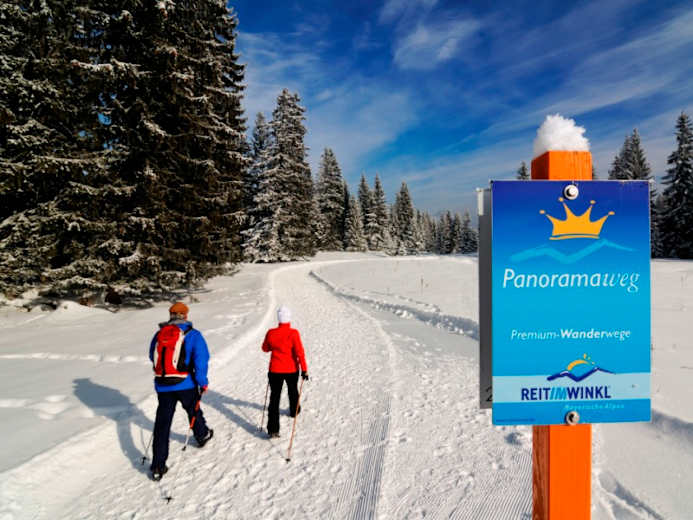 Eine leichte Winterwanderung für die ganze Familie bei Reit im Winkl im bayrischen Chiemgau, die auch mit Schlitten begehbar ist. Der erste Premium-Winterwanderweg Deutschlands geht auf über sechs Kilometer dahin und ist durchgehend gewalzt wie auch beschildert und mit festem Schuhwerk für Jedermann leicht begehbar.