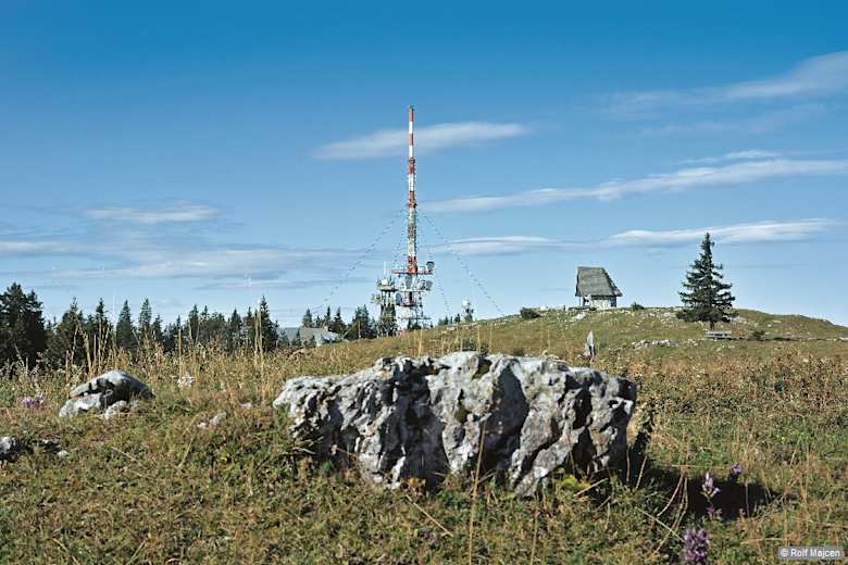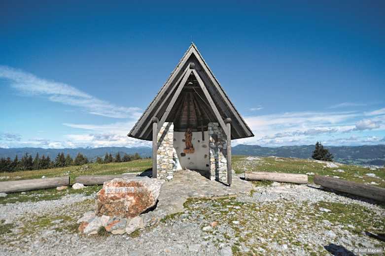 Von dort überqueren wir das gesamte aussichtsreiche, schwach gekuppte Hochplateau! Zuerst gehen wir zwischen ORF-Sender (96,5 m Höhe) und dem denkmalgeschützten Stubenberghaus hindurch zur Seilbahn-Bergstation, 1.436 m, wo der „barrierefreie alpine Wanderweg zum Ostgipfel“ (Wegweiser) anschließt. Auf dem Weg zum Ostgipfel (Schöcklkopf) mit der kleinen Sendeanlage kommen wir bei der schmucken Johanneskapelle, 1.435 m, dem jüngsten Schöckl-Wahrzeichen, vorbei. Der kleine offene Bau mit dem Lärchenholzdach beschützt eine vom oststeirischen Holzschnitzer Hans Pendl geschaffene Johannes-Skulptur. Wieder haben wir ein herrliches Rundum-Panorama und einen schönen Blick auf Graz und gehen zum Schöcklkopf, 1.423 m.