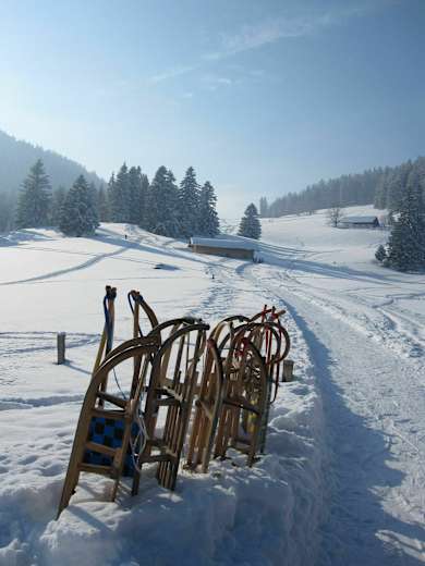 Statt mit dem Lift oder zu Fuß wieder ins Tal zu kommen, kann man alternativ auch von der Bergstation aus über die 3,5 km lange Naturrodelbahn ins Tal rodeln.
