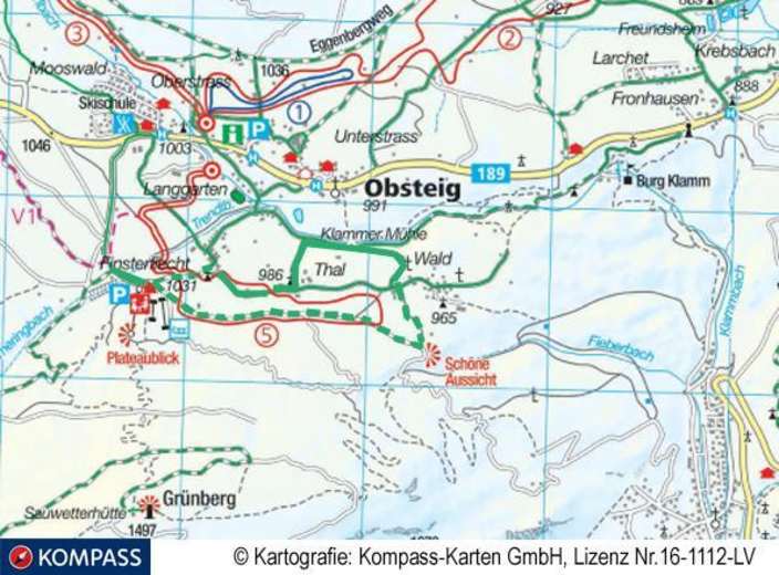 Startpunkt ist das Infobüro von Obsteig. Von dort geht man in südlicher Richtung zur Talstation des Grünbergliftes bei Finsterfiecht und östlich weiter zur schönen Aussicht. Zurück zum Ausgangspunkt gelangt man über Wald und die Klammer Mühle.
