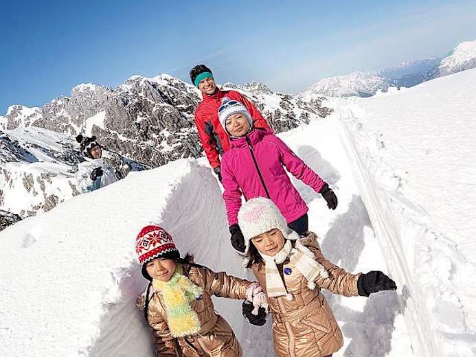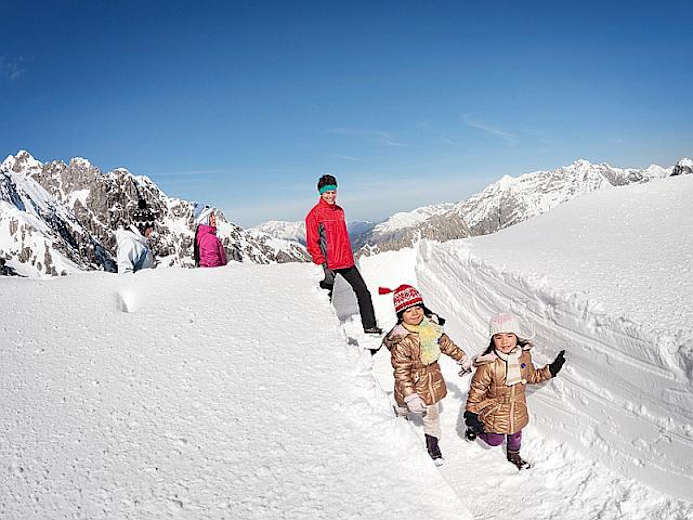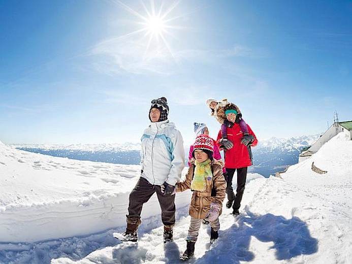 Die leichte Winterwanderung um die höchste Station der Innsbrucker Nordkettenbahnen, die Bergstation der Hafelekarbahn auf rund 2.300 Hm, im Tiroler Karwendel bietet für die ganze Familie nicht nur eine traumhafte Aussicht, sondern wird dort oben zum Erlebnis. Allerdings darf der markierte Wanderweg auf keinen Fall verlassen werden - Absturzgefahr!