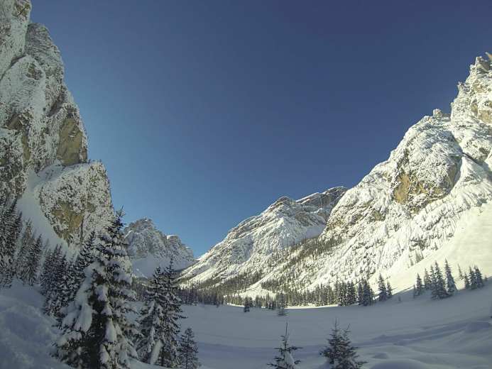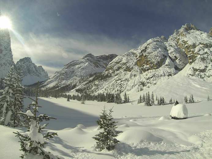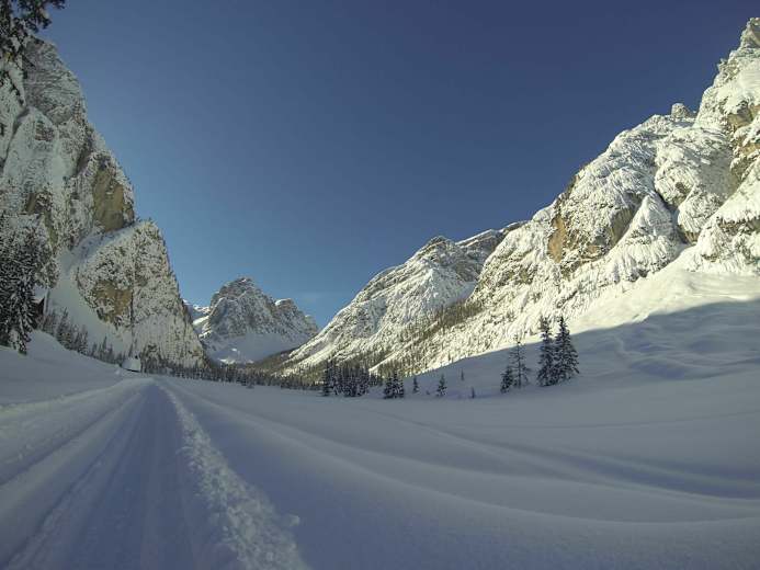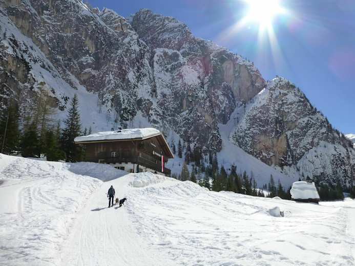 Landschaftlich sehr schöne und leichte Winterwanderung in den Dolomiten, im UNESCO Weltnaturerbe in Südtirol. Während der gesamten Wanderung befindet man sich inmitten der zauberhaften Berglandschaft der Sextner Dolomiten im Naturpark Drei Zinnen.