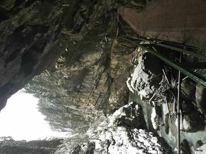 Auf gleichem Weg geht es wieder zurück durch die Klamm, wobei von der anderen Seite die Eisteppiche und Zapfen ganz anders aussehen. Dem Weg folgen, bis zum Aufstieg Walserschanze. Doch hier nicht bergauf, sondern über eine Brücke Richtung Waldhaus/Riezlern. Auf einem Metallsteg, der im Felsen fest verankert ist geht es Flussaufwärts bis zum Waldhaus. Vom Waldhaus über die Brücke auf dem gut gestreuten Weg bergauf bis zur Bundesstraße und Bushaltestelle.