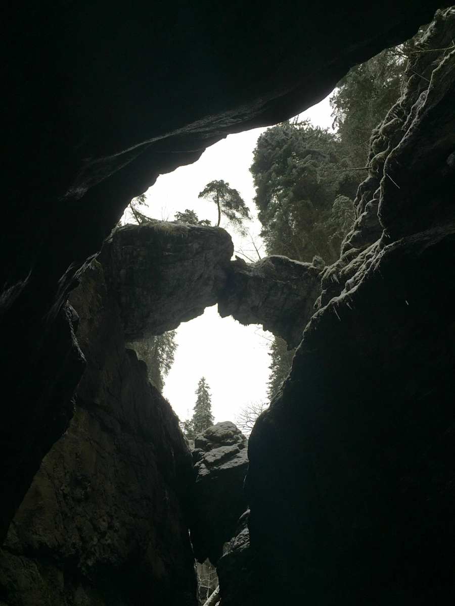 Auf gleichem Weg geht es wieder zurück durch die Klamm, wobei von der anderen Seite die Eisteppiche und Zapfen ganz anders aussehen. Dem Weg folgen, bis zum Aufstieg Walserschanze. Doch hier nicht bergauf, sondern über eine Brücke Richtung Waldhaus/Riezlern.