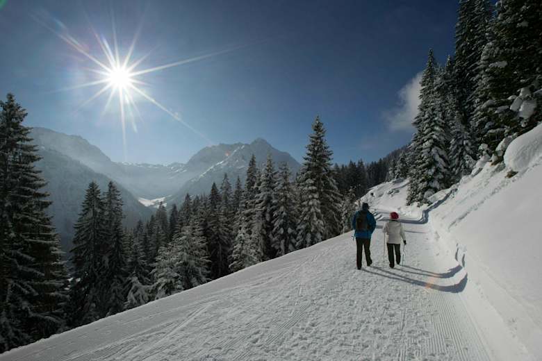 Genau das bietet im Vorarlberger Kleinwalsertal der sonnseitige Panoramaweg zwischen Hirschegg und Mittelberg. Er führt über die Abhänge des Heubergs, die auch im Hochwinter von der Morgensonne beschienen werden.