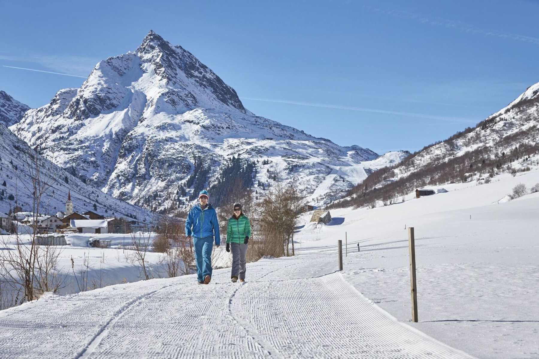 Leichte Steigungen und ein beeindruckendes Landschaftsbild mit den mächtigen Dreitausendern des Silvrettagebirges zeichnen diese Winterwanderung von Galtür, dem höchsten Ort des Paznaun, nach Wirl aus.