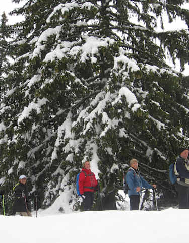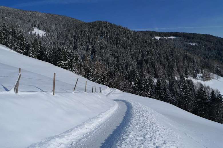 Später ist man schon am Sonnenblumenweg angelangt, wo man den weiteren zügigen Anstieg am Mohnweg in Anspruch nimmt. Am Mohnweg nun über einige Serpentinen hinauf bis zum Gasthof Ploninger, wo man sich in östliche Richtung weiterspazierend auf einem beschilderten Aussichtsweg befindet und die Sonne genießen kann. Der stetige Anstieg wird mit einem feinem winterlichen Panorama aufs gesamte Kirchheimer Tal belohnt.