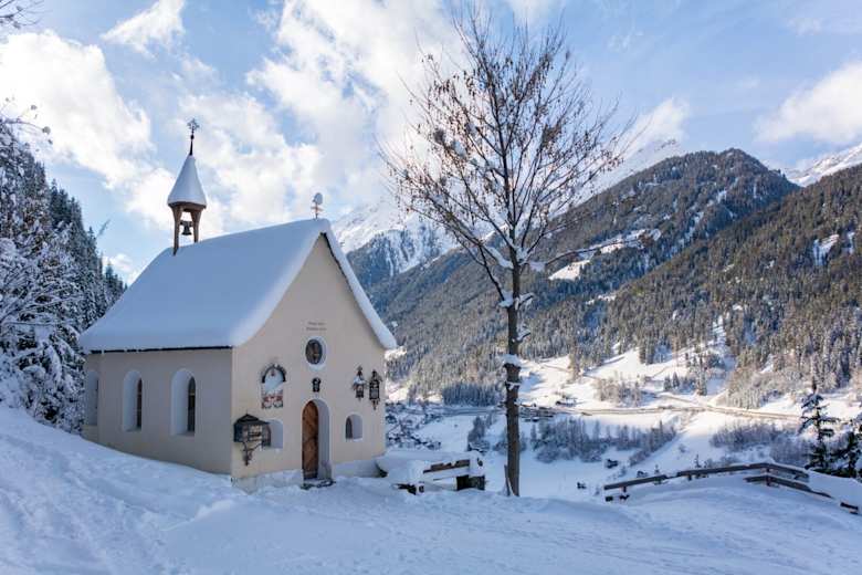 Eine idyllische Winterwanderung zur Rotwegkapelle (1805 erbaut) findet sich im Paznaun in Tirol. Kondition sollte man für den Anstieg schon mitbringen, von oben bietet sich ein herrlicher Ausblick auf das Paznauner Untertal.