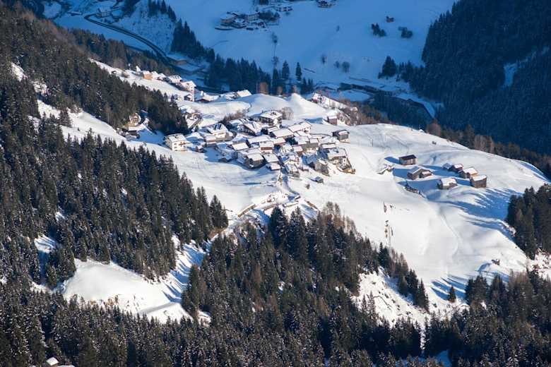 Weiter durch die verschneiten Wälder bis nach einiger Zeit die Talstation des Doppelsesselliftes Gongall erreicht ist. Nun heißt es, den Waldweg Richtung Oberhaus einschlagen und über die Gemeindestraße wandert man dann durch die Weiler Stadlen, Hof, Obermühl, Grubegg und Larchi bis nach Kappl.
