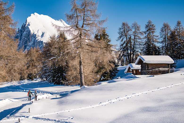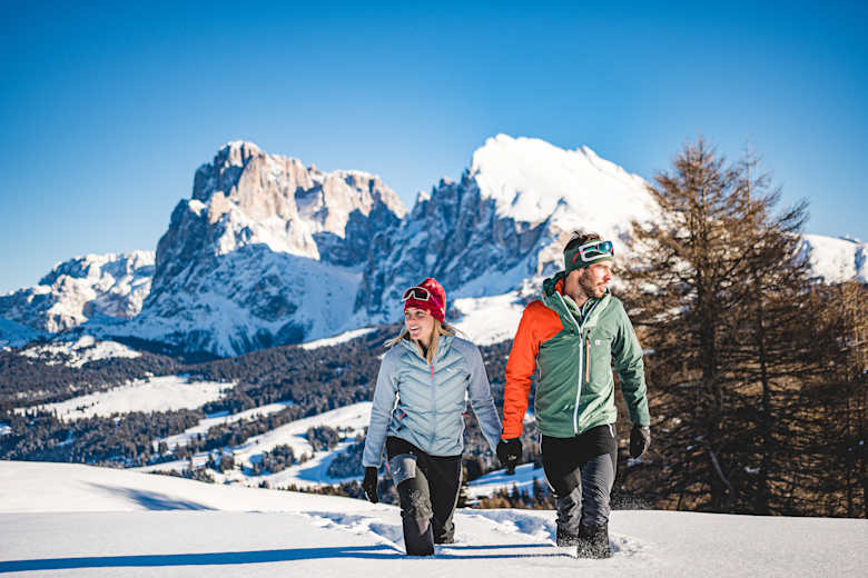 Eine gemütliche und abwechslungsreiche Winterwanderung von Compatsch bis zur Mahlknechthütte und abwärts nach Saltria. Neben dieser lädt auch die Almrosenhütte zur Einkehr ein. Die Tour ist familienfreundlich und bietet mit Langkofel und Plattkofel ein eindrucksvolles Panorama auf das UNESCO Welterbe der Dolomiten.