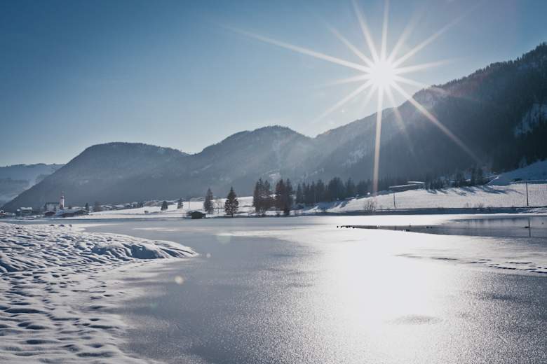 Nach einer gemütlichen Einkehr führt der Weg am anderen Seeufer und bei fabelhafter Aussicht auf die schneebedeckten Gipfel der Kitzbüheler Alpen zurück zum Ausgangspunkt.