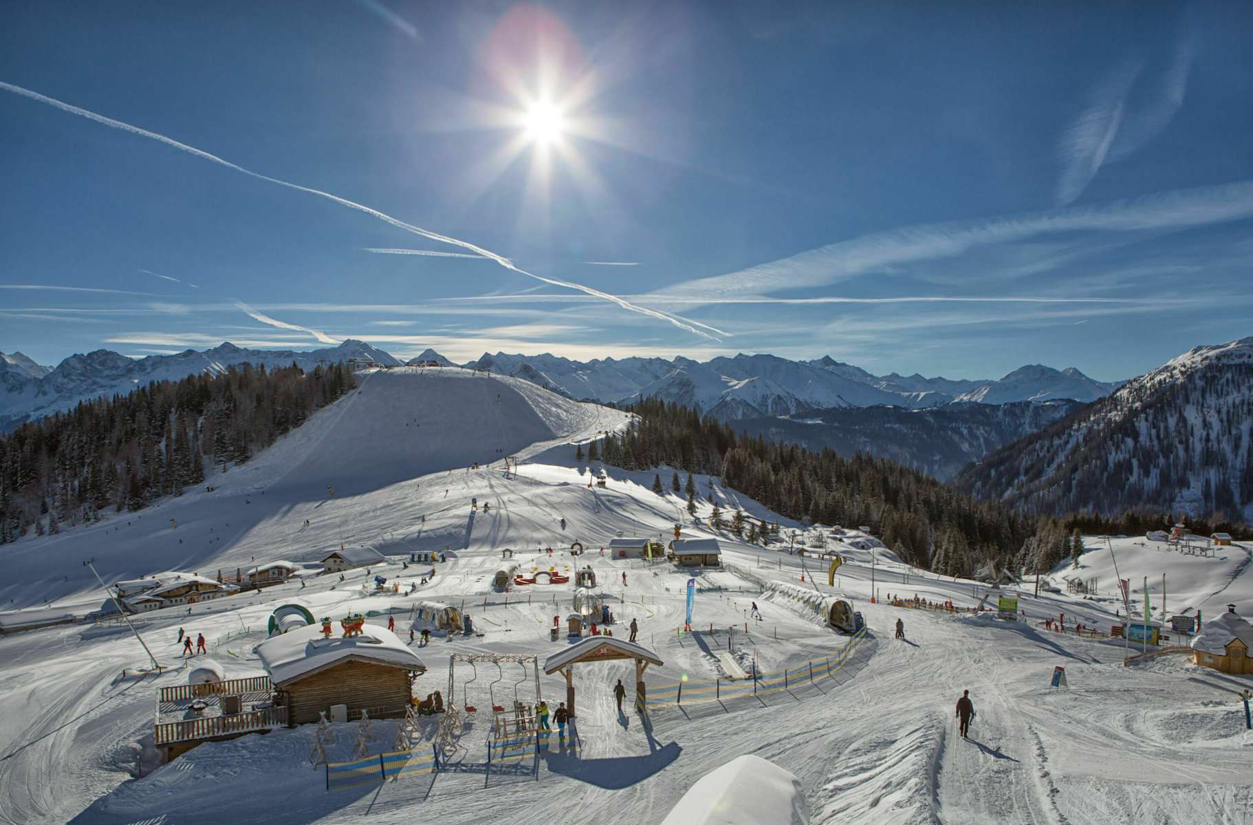Parkplatz am Dorfeingang von Serfaus. In Serfaus gelangt man mit der Dorf-U-Bahn vom Parkplatz zu den Anlagen, da der Ort verkehrsberuhigt ist.