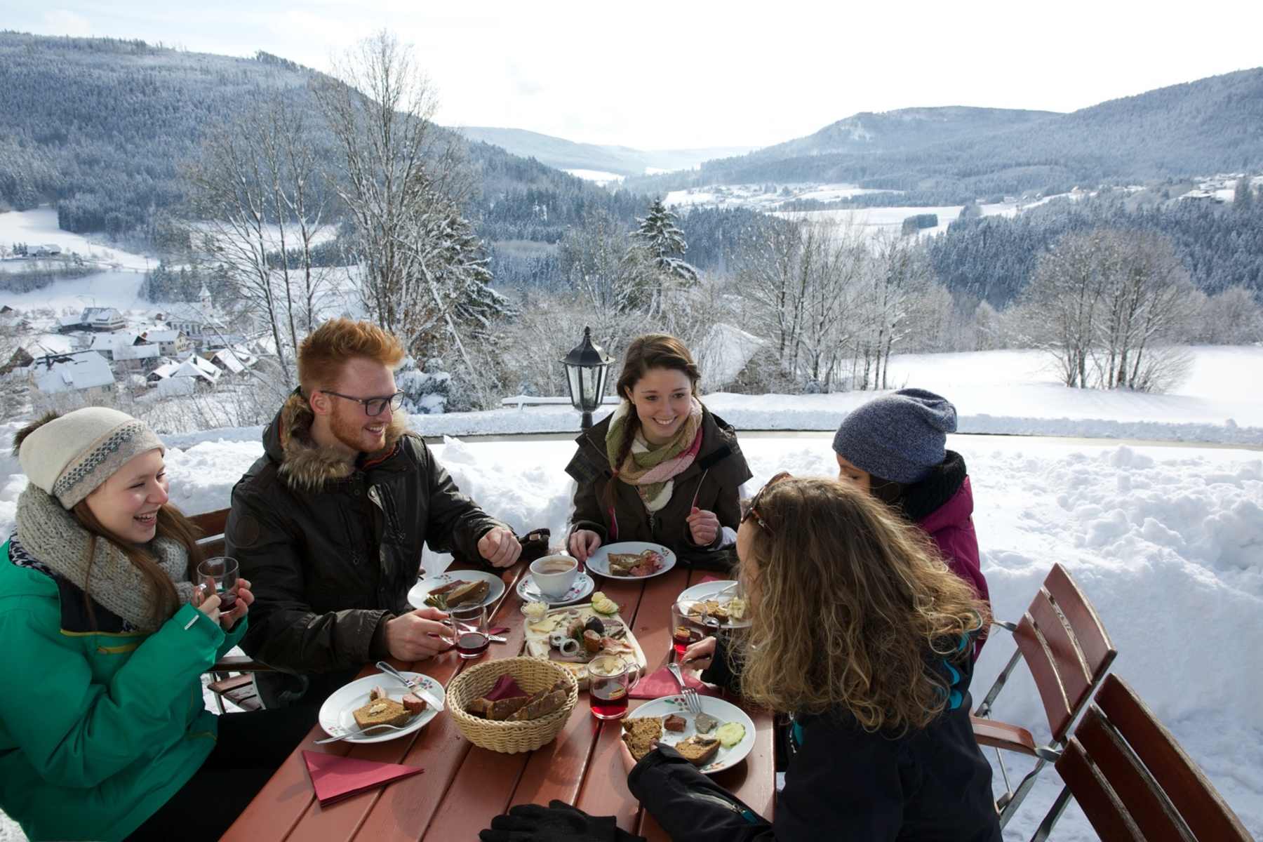 Familienfreundliche Winterwanderung im Nördlichen Schwarzwald in Baden-Württemberg. Ziel dieser Rundtour ist das beliebte und urige Panorama-Hütte des Hotel Löwen auf der Sonnenterrasse des Murgtales.