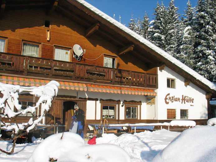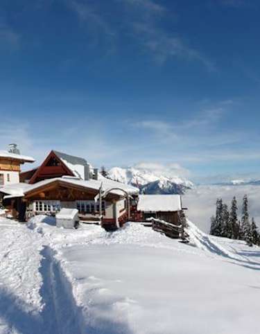 An schönen Tagen kann man von der Enzianhütte einen tollen Blick über das Inntal zu den Brennerbergen genießen, während einen die Wintersonne wärmt.
